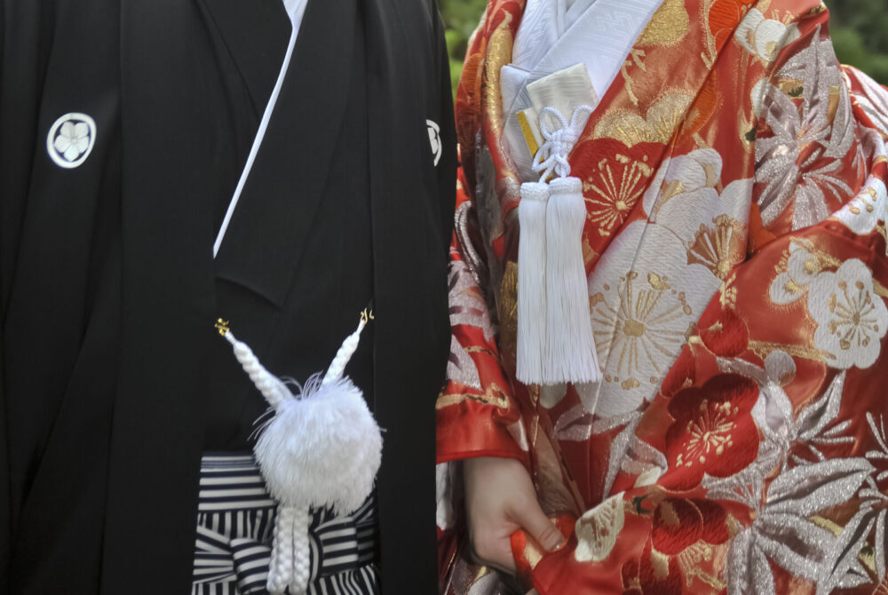 新郎様が結婚式で和装を着る場合、紋付袴を着るのが一般的で色は黒が多いですが、色打掛の色に合わせて白やグレー、紺などの色を選ぶ場合もあります。